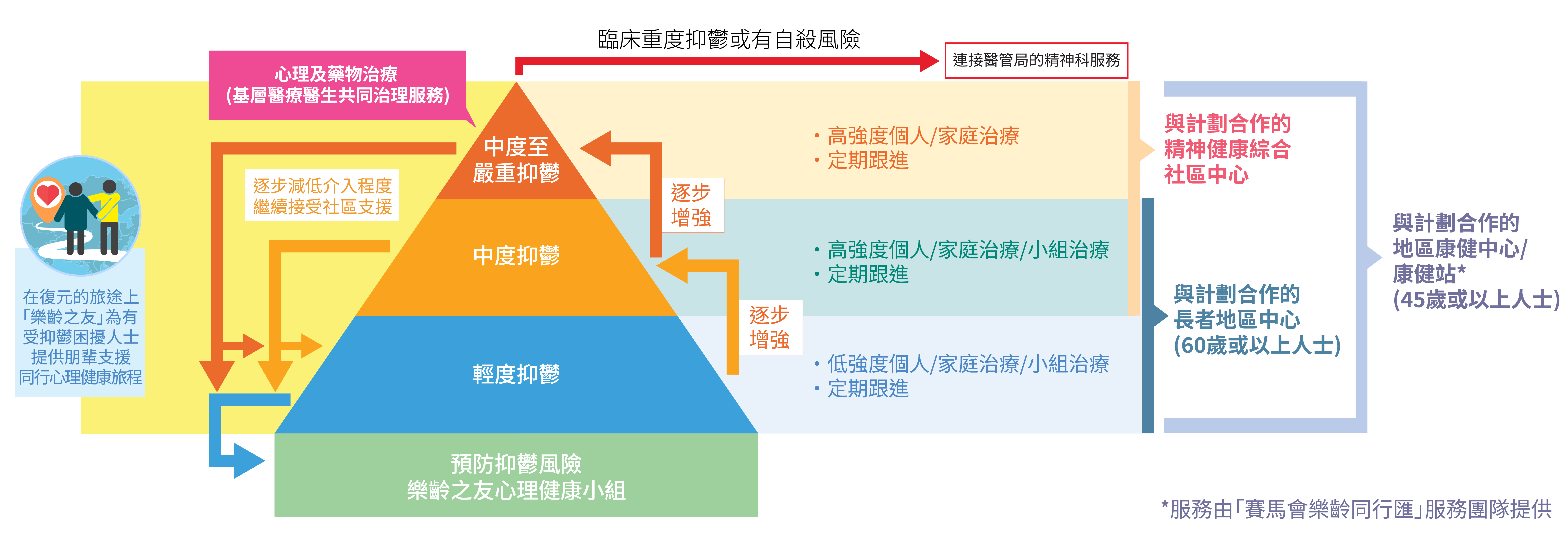 透過連結長者地區中心、精神健康綜合社區中心及指定地區的地區康健中心/ 康健站,建立逐步介入模式,並加強社區內的醫社合作,為有抑鬱症或抑鬱徵狀的中高齡人士提供標準化的預防和實證為本的介入服務。